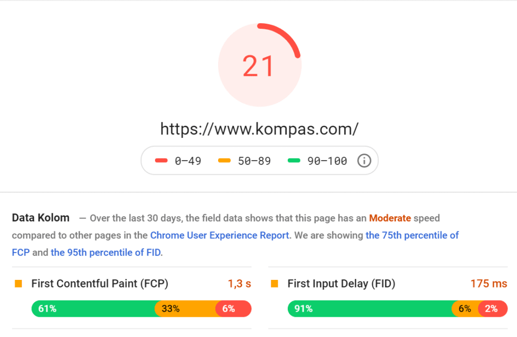 Even though the overall score is pretty low, both FCP and FIP are dominated by green. This means the majority of visitors can see and interact with the web page within the recommended loading time.